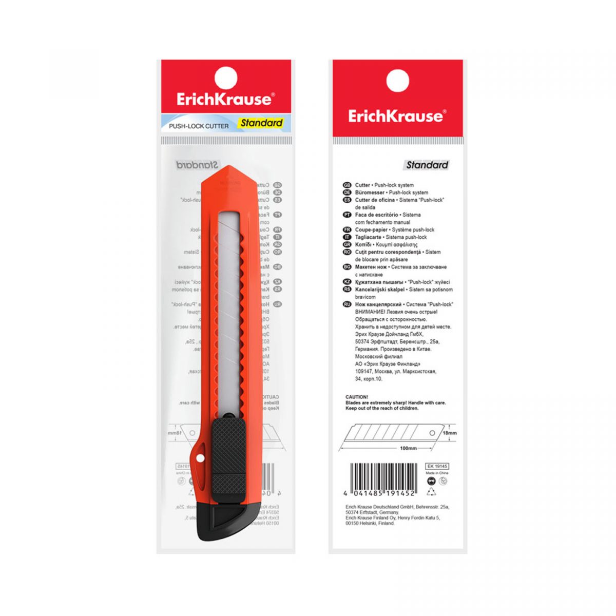 Erich Krause barkácskés visszahúzható pengével. A penge kopásálló acélból készült kétoldalas élezéssel, továbbá szegmentált és törhető. Külseje könnyű és tartós műanyagból áll.